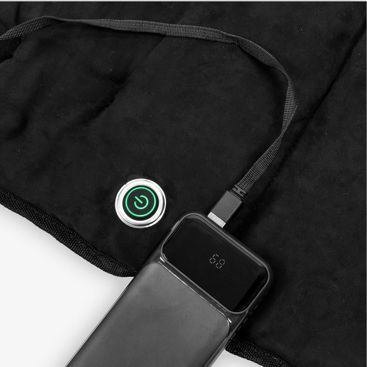 Schliessen Sie die aufgeladene Powerbank über das USB-Kabel am Kissen an. Drücken und halten Sie den Ein-/Ausschalt-Knopf für 3 Sekunden um die Heizfunktion ein- oder auszuschalten. Mit einem kurzen Knopfdruck wechseln Sie zwischen den verschiedenen Heizstufen. Der Knopf leuchtet in eingeschaltetem Zustand konstant und zeigt über 3 verschiedene Farben an, auf welcher Stufe Sie sich befinden: